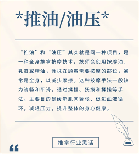 其实“推油”、“油压”和“指压”是三种常见的服务项目,都是以放松身心、缓解压力为主要目的的按摩方式。它们通过不同的手法和技术,针对不同的需求和症状,为客户提供个性化的放松体验。